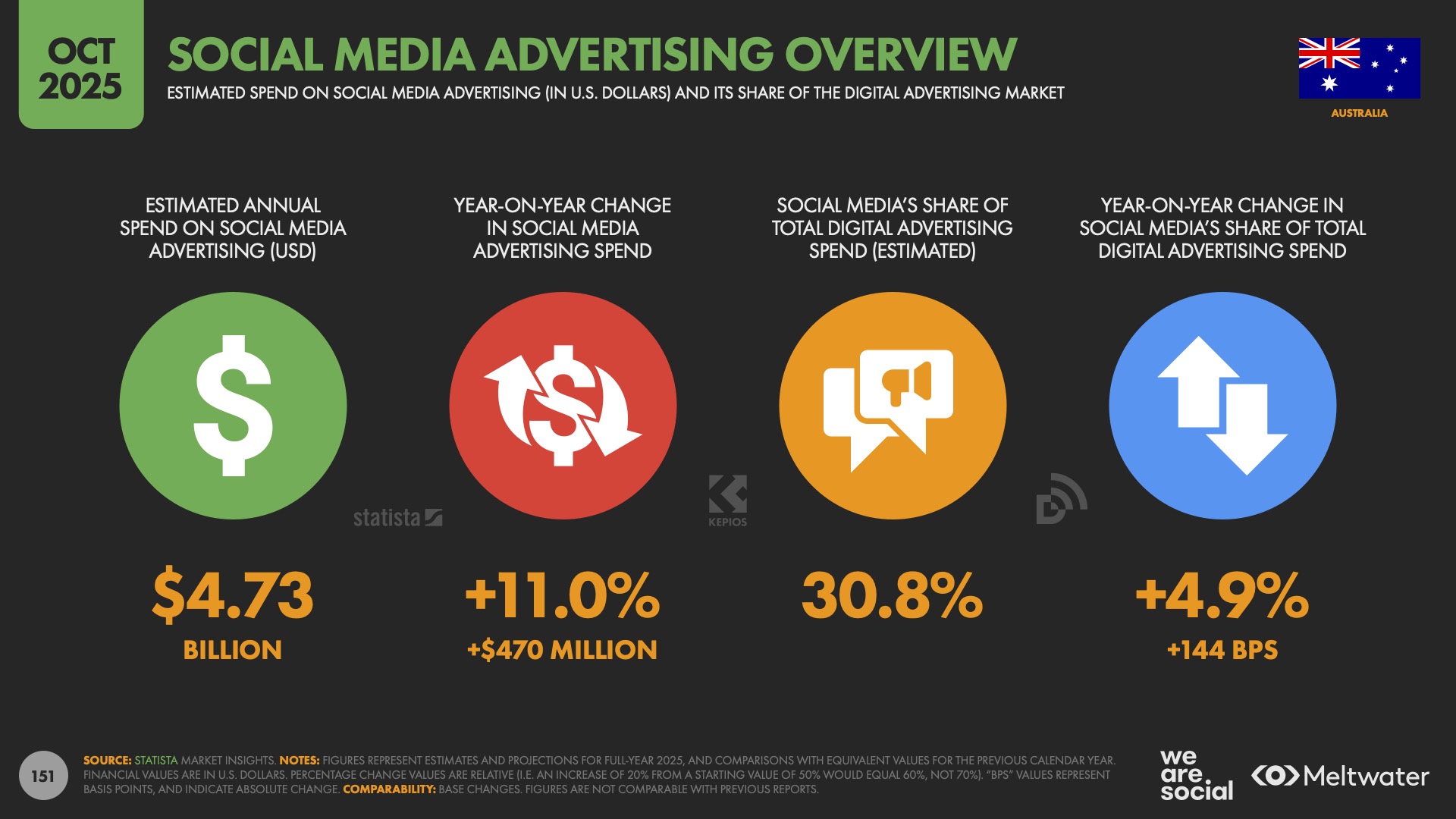 In 2025, Australia’s total advertising spend hit USD 20.7 billion, with digital accounting for 74% of that. Social media captured USD 4.73 billion (up 11% year-on-year), while influencer marketing reached USD 590 million (up 13.5%). More and more brands are investing where people are truly paying attention: creator-led content, platform-native formats and social-first storytelling.