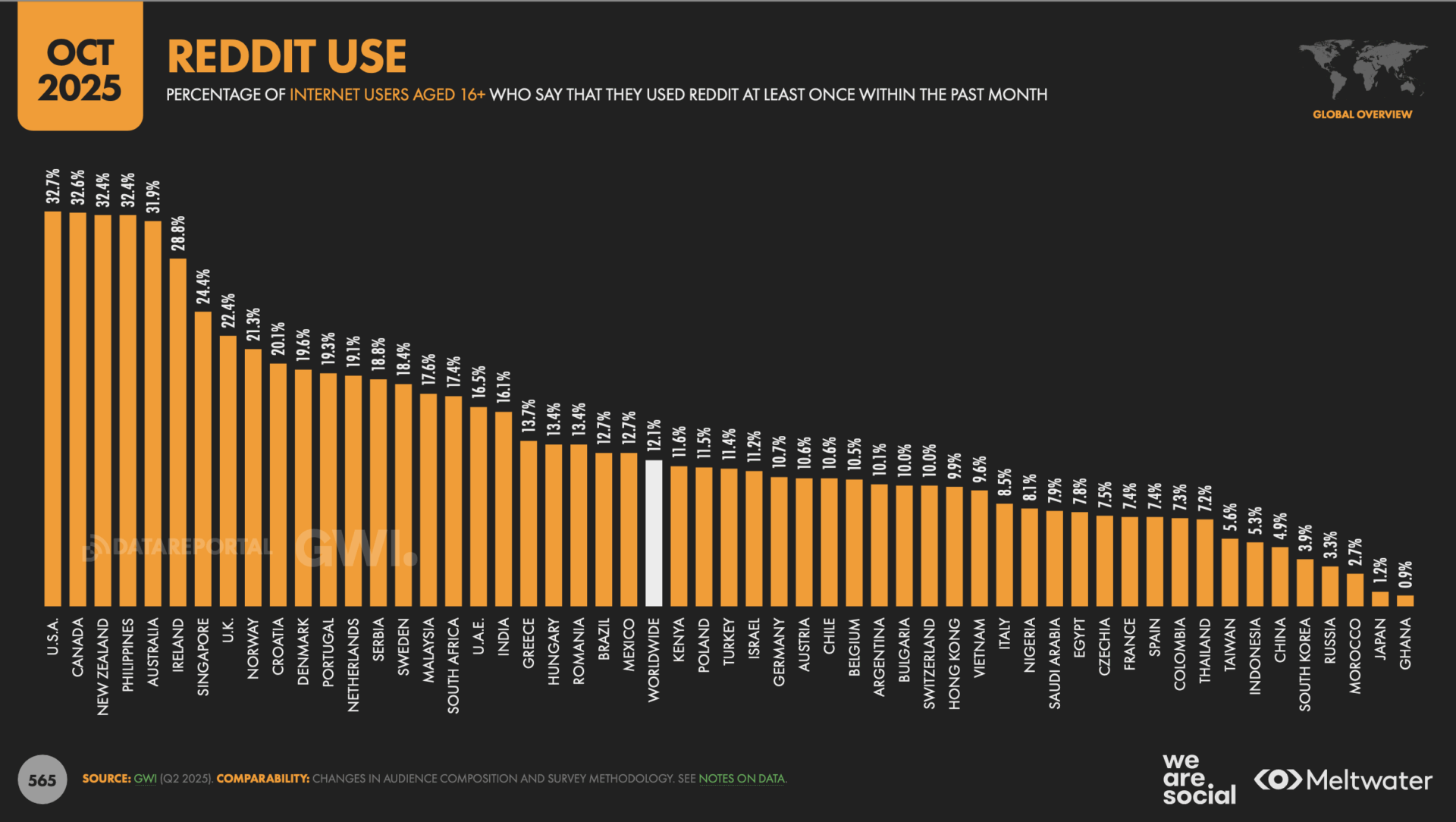 With more than half a billion users globally, Reddit’s presence in APAC is accelerating fast. As noted in We Are Social and Meltwater’s Global Digital Report, one in three Australians and Filipinos aged 16+ visited Reddit in the past month, with Singapore close behind at one in four. It’s no surprise: in cultures where peer recommendations matter, Reddit’s community-first structure – built on anonymity, honesty and niche subcultures – is a natural fit.