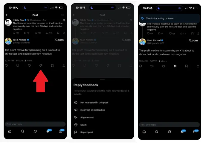 X is testing comment downvotes (again) to try to tackle the mass AI-generated spam on the platform. A new thumbs-down icon will appear on post replies, and users can choose a reason for downvoting. The options include: Not interested in this post, Incorrect or misleading, AI-generated, Spam and Report post. Downvotes won’t impact the post’s engagement but will instead help X manage posts. Here’s the catch – the downvote option is only available to X Premium subscribers.