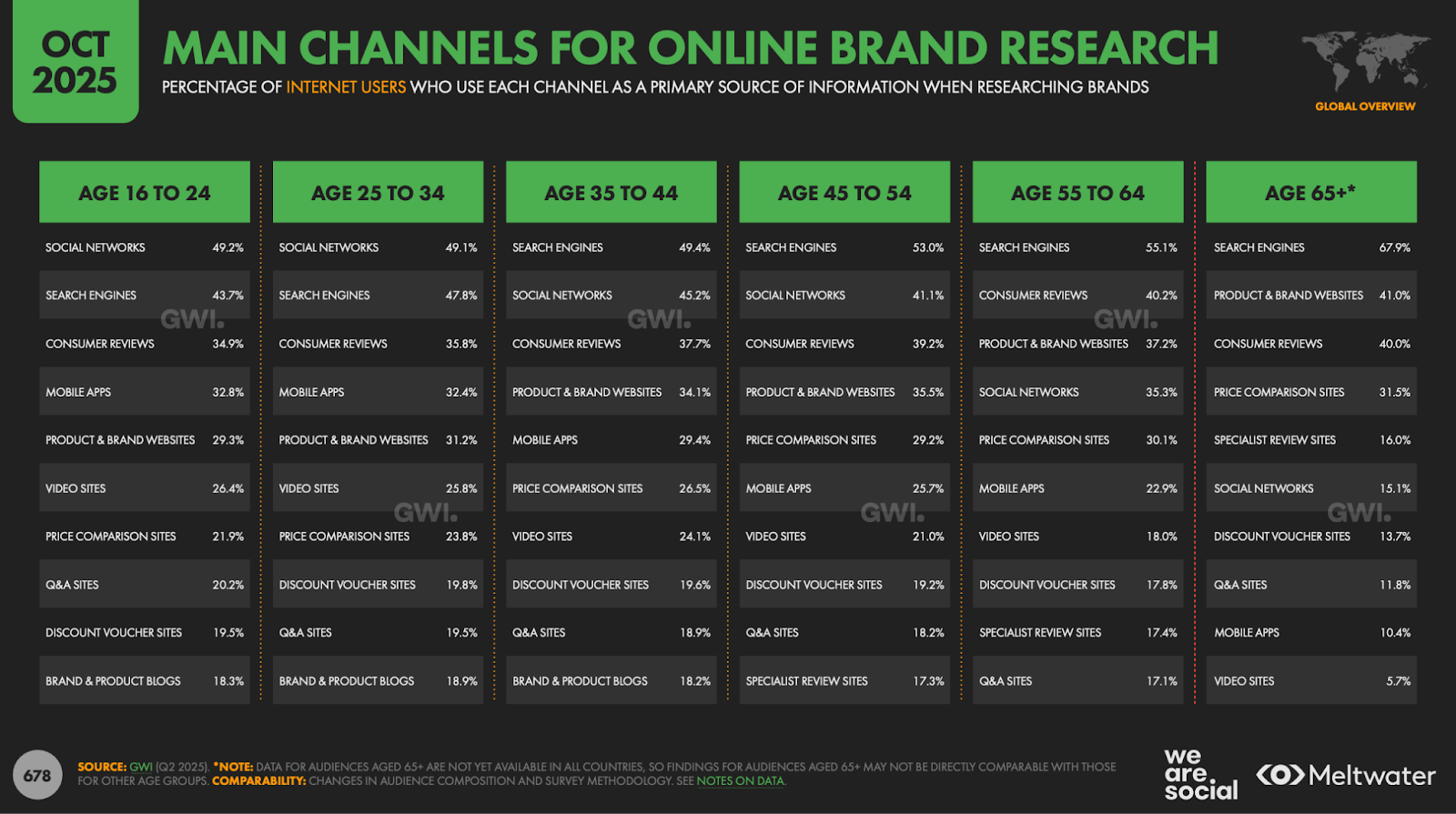The data from our latest Global Digital Report shows that 44% of online adults use social media to research brands ahead of a potential purchase; Instagram, TikTok and Facebook are the platforms people are most likely to use to do so. But the real shift is happening with the next generation of consumers. Social networks are now the main media channel for audiences aged 16 to 34 when it comes to online brand research – a social scroll is outpacing traditional text-based search as the go-to discovery engine for young adults. They aren’t just engaging with brand posts; they’re actively searching within the platforms themselves, using tools like the search bar to find product reviews, tutorials, and community-driven opinions.