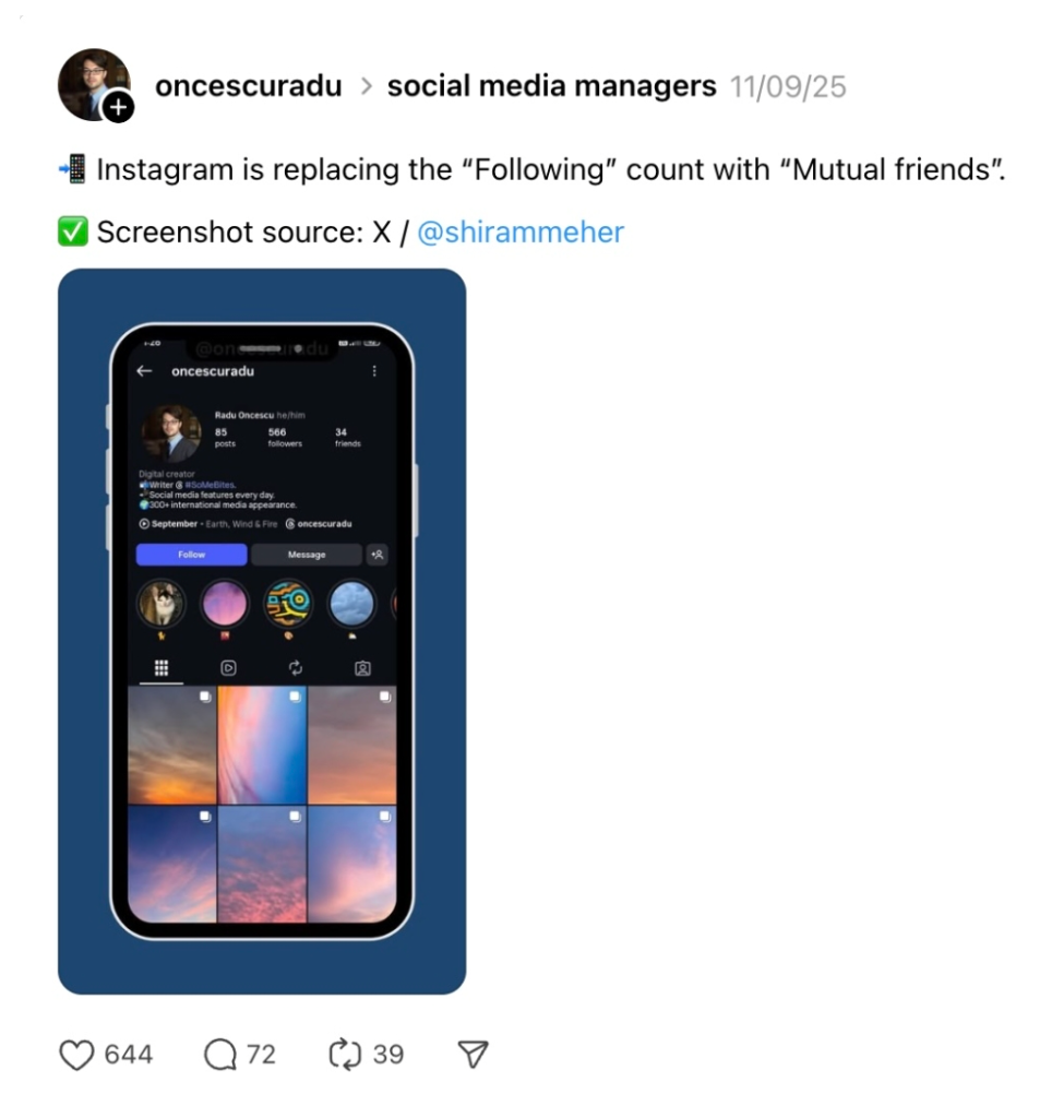 Instagram expérimente une mise à jour qui remplacerait le compteur de « Following » par « Friends », ne montrant que les personnes qui vous suivent mutuellement. La plateforme a confirmé le test à Business Insider, précisant qu’« il s’agit actuellement d’une expérimentation à petite échelle pour observer la réaction des utilisateurs·trices face à la mise en avant des connexions amicales. » Donc si vous suivez un nombre incroyable de célébrités (qui, pour une raison inconnue, ne vous suivent pas en retour), vous risquez de paraître sérieusement impopulaire…