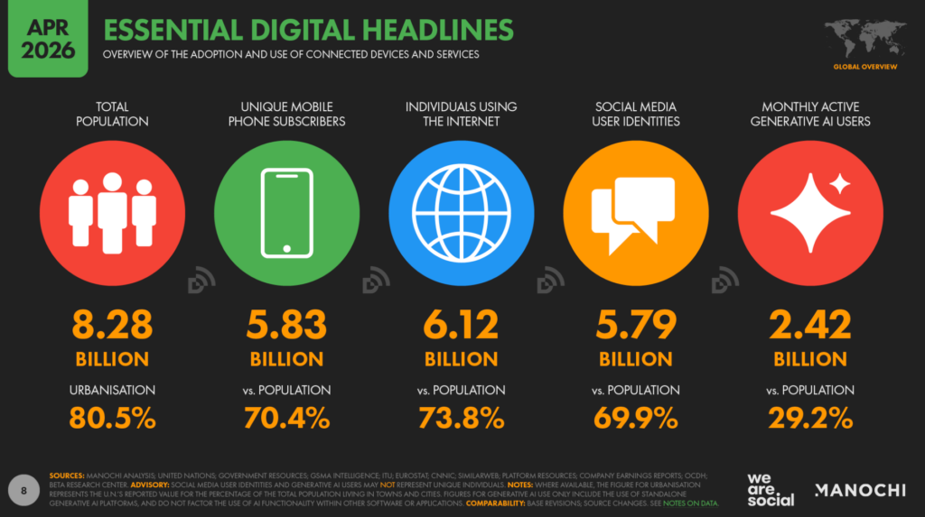 Ceci est un extrait de notre article sur l’update mi-année de notre report monde Digital 2026. Pour l’analyse complète par Simon Kemp de Manochi, cliquez ici. (en anglais)