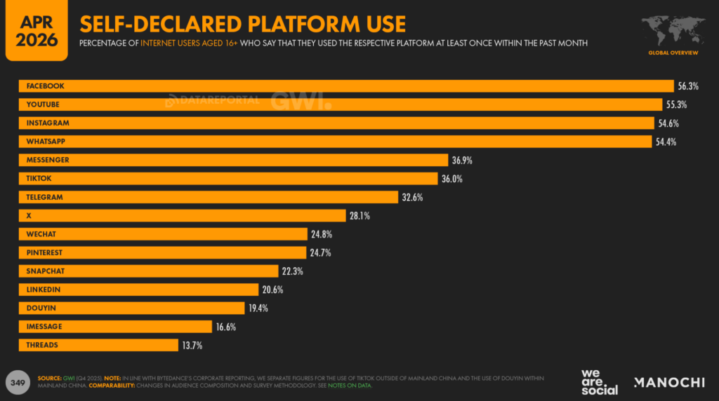 Mais quelles sont les plateformes sociales qui attirent aujourd’hui les plus larges audiences ? Selon les données auto-déclarées de GWI, Facebook reste la plateforme sociale la plus utilisée au monde, avec 56,3 % des internautes âgés de 16 ans et plus déclarant l’avoir utilisée au cours du dernier mois.