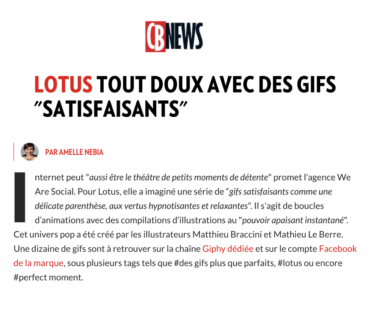 Afin de répondre à la volonté de Lotus de communiquer sur ses produits, et particulièrement sur son innovation Papier Toilettes “Confort Sans Tube”, We Are Social a déployé une activation pour les valoriser en surfant sur une tendance sociale, virale et engageante : Les Satisfying GIFs. Si quelques marques se sont prêtées à l’exercice, notre objectif aura été de se démarquer en ajoutant aux GIFs la plus-value des produits Lotus. La texture, la résistance et la douceur des mouchoirs et papiers toilettes sont ainsi représentées dans des univers oniriques, offrant aux internautes une pause purement satisfaisante. Une opération qui capitalise sur les assets de la marque pour explorer habilement de nouveaux territoires et rapprocher toujours plus Lotus de ses publics. Un peu de douceur dans un monde digital sous tension 😉