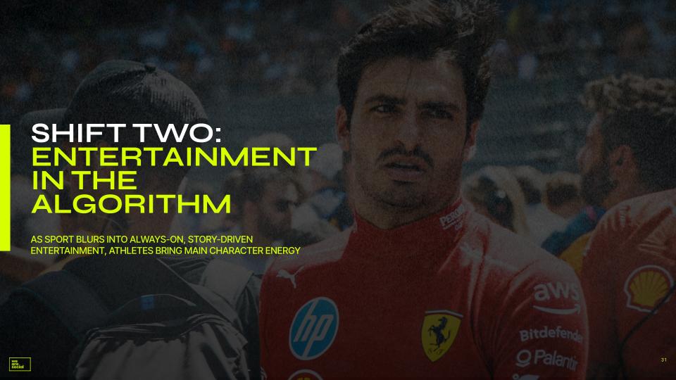 Sport is becoming equal parts entertainment and performance, with new distributors and platforms contributing to emerging fandom habits. As Netflix gets more involved in sports, fandom is being sparked not only from flagship reality and docu-style television, but even TikTok. Now, sports content and characters are spinning off from the anchor events of games themselves. This shift has elevated athletes as “main characters.”