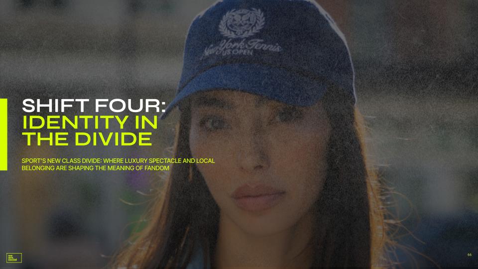 Sports fandom and experiences are bifurcating. At one end of the spectrum is luxury, prestige and signalling, and at the other, grassroots, fan-first belonging for “real fans”. As tentpole events become a hotter and hotter ticket, fans focused on the community are developing their own events without all the trappings of an increasingly affluent customer and “luxury” experiences.