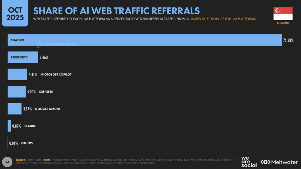 AI tools are officially mainstream. More than a third of Singaporeans now use ChatGPT each month — making it one of the top five most visited websites in the country, according to Similarweb and SEMrush. ChatGPT also dominates AI web traffic, accounting for over three-quarters of all AI-related referrals. Perplexity trails behind with 8.46%.