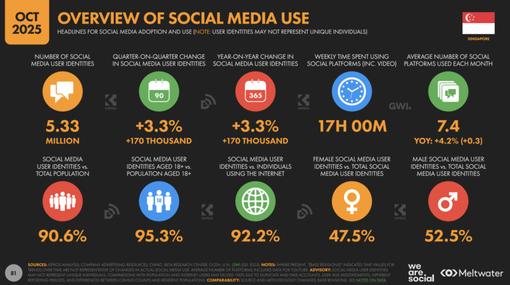 Social media isn’t slowing down in Singapore — in fact, it’s still finding new ways to grow. According to the report, social media user identities have climbed 3.3% year-on-year, reaching 5.33 million people — that’s a massive 90.6% of the population.