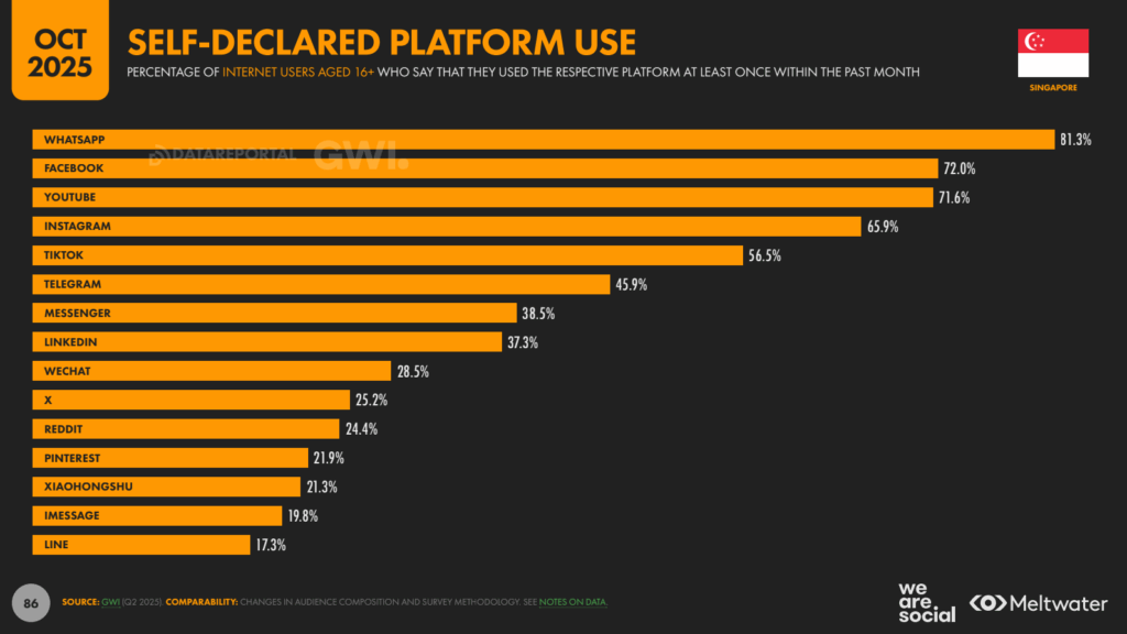 And what’s everyone doing online? Mostly chatting, scrolling, and connecting. Chat and messaging apps remain Singapore’s top go-to platforms, closely followed by social networks.