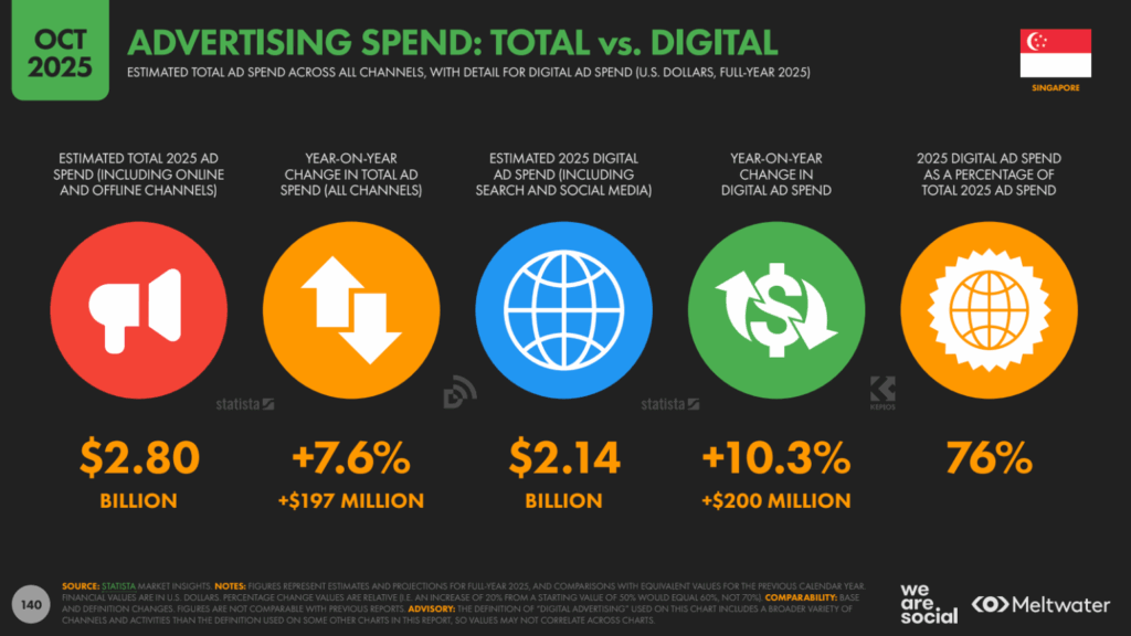 There’s good news for the industry, too. Singapore’s total ad spend is projected to hit US$2.8 billion in 2025, up 7.6% year-on-year. Digital channels now make up 76% of that spend (US$2.14 billion), a 10.3% jump from last year. And within that, social and influencer marketing are both on the rise: