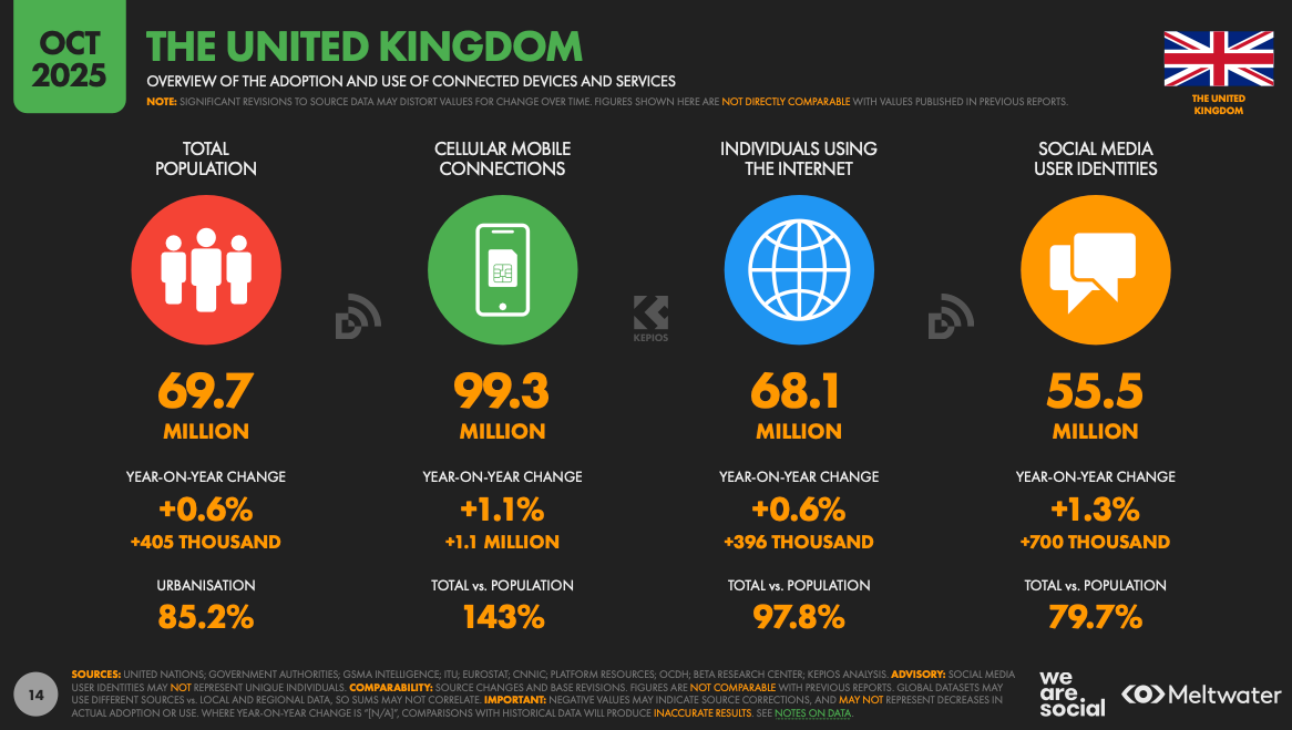 We’ve just launched our latest report in the Global Digital Report series: Digital 2026: The United Kingdom. In collaboration with Meltwater, a global leader in media, social and consumer intelligence, it’s a 165 page deep dive that covers the entire UK digital ecosystem; from social media to ecommerce, mobile to smart devices, and more. Here are some of the highlights.