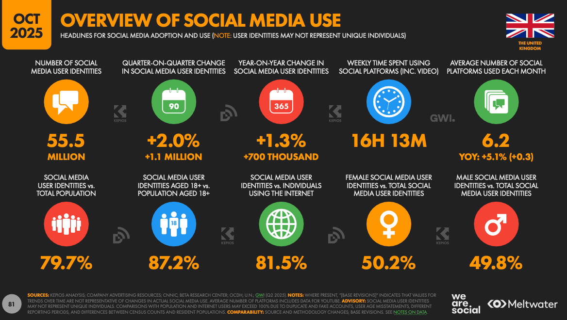 There are 68.1 million individuals using the internet and 55.5 million social media user identities in the UK. Social media users spend 16h 13m weekly on social channels, using an average of 6.2 platforms each month – lower than the global average of 18h 36m and 6.75 platforms.