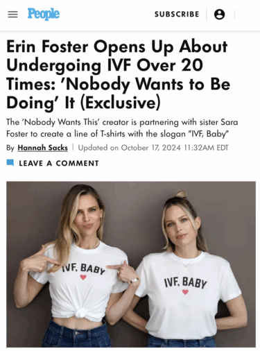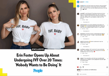→ With the Fosters, we co-created the “IVF, Baby” t-shirt—raising funds for RESOLVE and symbolizing solidarity through fashion.