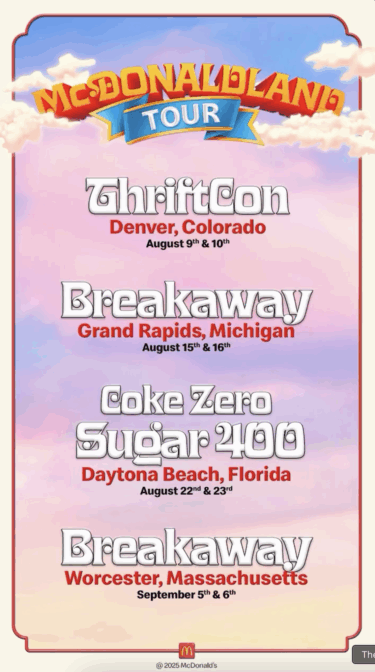 We extended the PacSun x McDonald’s collab through a shoppable McDonaldland pop-up at ThriftCon, offering exclusive early access, merch drops, and giveaways tied to each tour stop.